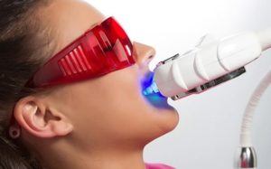 Этап 2 – покрытие зубов гелем. Далее зубы покроют прозрачным кислородным гелем на основе 44% Carbamide Peroxide и начнут отбеливание с лампой холодного свечения на 10 минут.